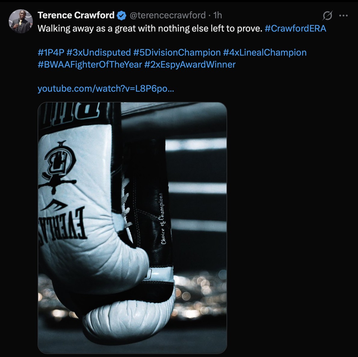 A través de un video en redes sociales el cual tituló "despidiéndome como un grande con nada más por probar", Crawford hizo oficial su decisión.