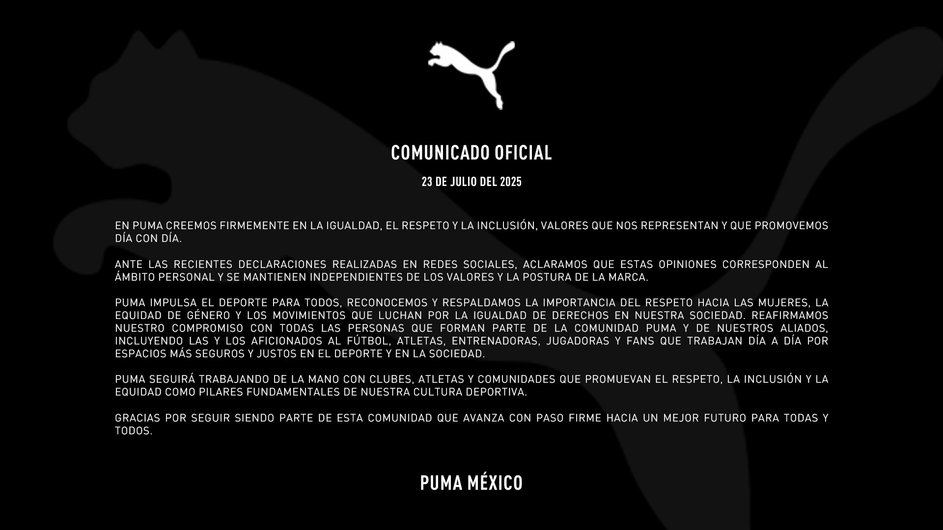 Asimismo, la empresa PUMA reafirmó su compromiso con la equidad de género y los movimientos que luchan por la igualdad de derechos: “PUMA impulsará siempre el deporte para todos, reconociendo y respaldando el respeto hacia las mujeres y la creación de espacios más seguros y justos en el deporte y en la sociedad.”
