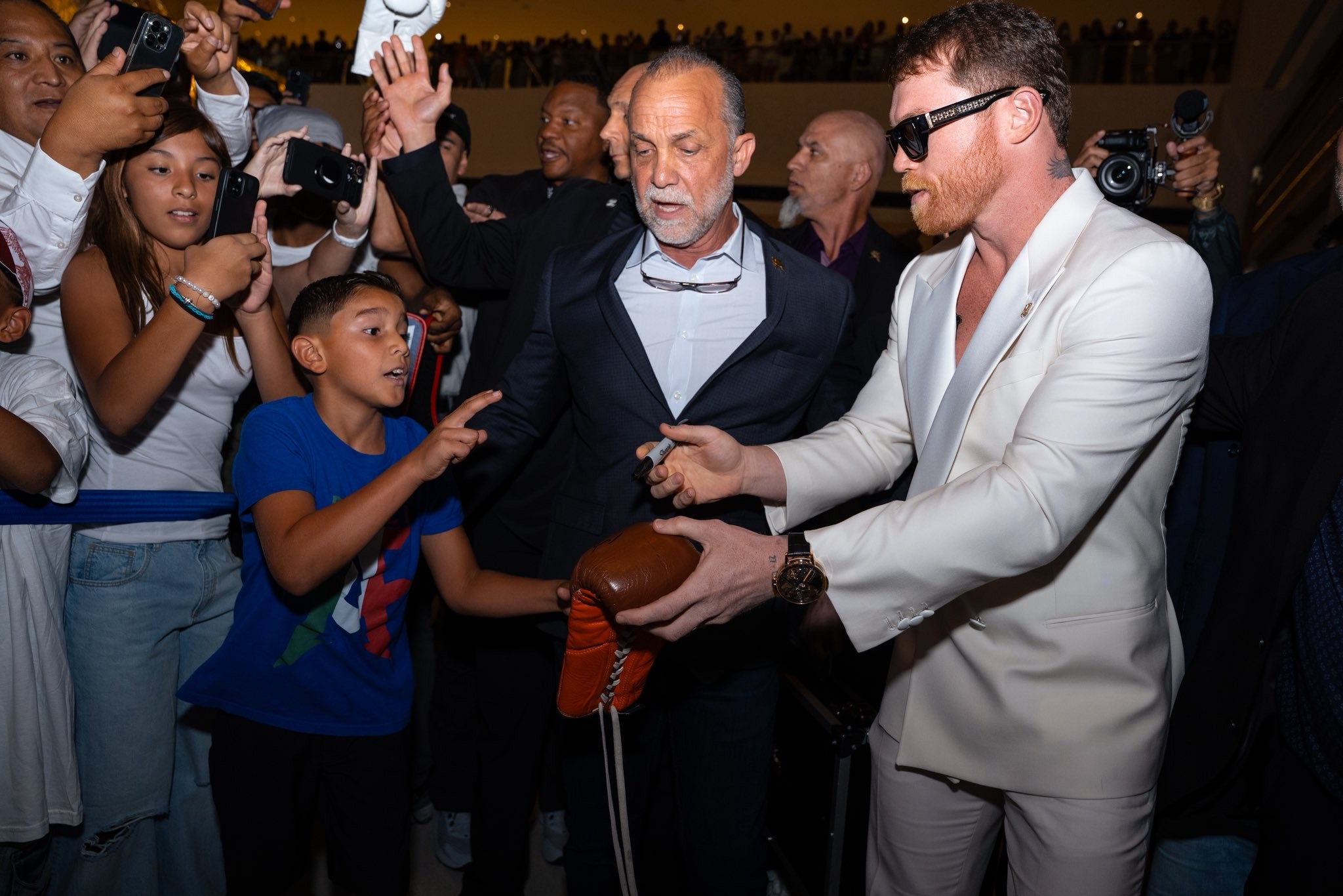 El mexicano regresó a Las Vegas, territorio que ha visto escribir su nombre con letras doradas en la historia del boxeo. Desde su presentación histórica en las Fuentes del Bellagio hasta la caminata por la alfombra roja en el Fontainebleau, Canelo se mostró seguro y elegante con traje blanco y lentes negros, acompañado de su entrenador Eddy Reynoso, del ministro árabe Turki Al-Sheikh y del presidente del Consejo Mundial de Boxeo, Mauricio Sulaimán.