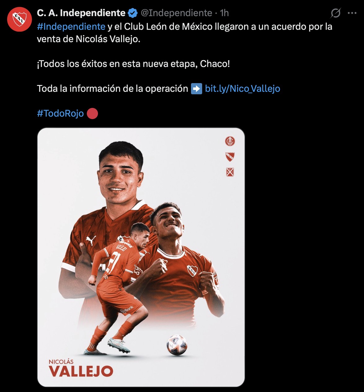León.- El Club León sumará un nuevo refuerzo de cara al próximo torneo, luego de que Independiente de Avellaneda anunciara oficialmente la salida de Nicolás Vallejo. Fue el propio club argentino el que confirmó la transferencia a través de sus canales oficiales, despidiéndose del futbolista y deseándole éxito en esta nueva etapa.