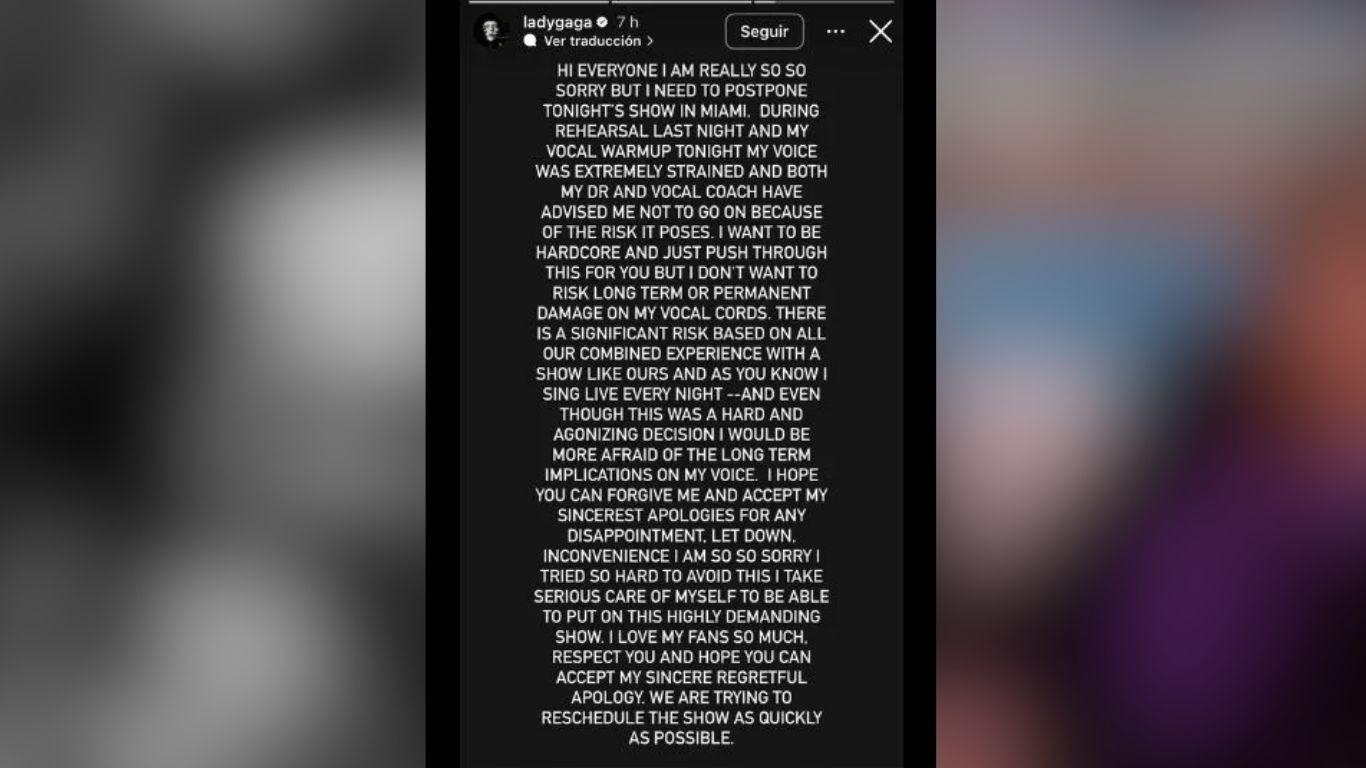 “Hola a todos, de verdad lo siento muchísimo, pero necesito posponer el show de esta noche en Miami.Durante el ensayo de anoche y en mi calentamiento vocal de hoy, mi voz estaba extremadamente forzada y tanto mi doctor como mi entrenador vocal me aconsejaron no presentarme debido al riesgo que implica.
