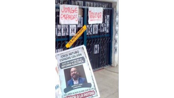 El diputado federal panista, Jorge Espadas Galván, responzabilizó a la dirigencia nacional de Morena y al presidente Andrés Manuel López Obrador de lo que llamó la vandalización de las casas de enlace de los cuatro diputados federales panistas originarios de León, luego de que la iniciativa de reforma eléctrica del presidente Andrés Manuel López Obrador no logró la mayoría calificada en el Congreso federal. En redes sociales simpatizantes de Morena difundieron la "clausura" simbólicamente las casas de gestión de los legisladores. En la de Espadas colocaron cartulinas con la leyenda "traidor". "Son hechos impulsados desde la dirigencia de Morena, que impulsa el presidente de la República, es una apología del delito, los invitan a vandalizar y aquí hubo un personaje que acudió a las Casas de Enlace". La dirigencia estatal del PAN emitió un comunicado en el que lamenta las manifestaciones morenistas. "Considerar “enemigos de la patria” a una mayoría que no se pliega a sus caprichos y ocurrencias, es un recurso tradicional de los autócratas y los dictadores. A pesar de las amenazas, intimidaciones y actos vandálicos, las y los diputados de Acción Nacional en Guanajuato no bajarán la guardia".