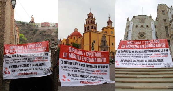 Las mantas del Cártel del Aborto aparecieron en puntos emblemáticos de Guanajuato Capital, como la Alhóndiga de Granaditas, la Universidad de Guanajuato, la Plaza de la Paz, el Teatro Juárez, la fuente del Parque de las Ranas, entre otros.Esto sucede justo el día en que, Eugenia García Oliveros, diputada local por Morena y presidenta de la comisión de Justicia, presentó ante la comisión de Gobernación y Puntos Constitucionales, su voto particular en favor de las iniciativas.También se da un día después de que integrantes de la Red de Acompañantes de León, denunciaran ser víctimas de amenazas en redes sociales, por su labor para asesorar a quienes desean interrumpir su embarazo de forma segura. [caption id="attachment_174199" align="aligncenter" width="1024"]