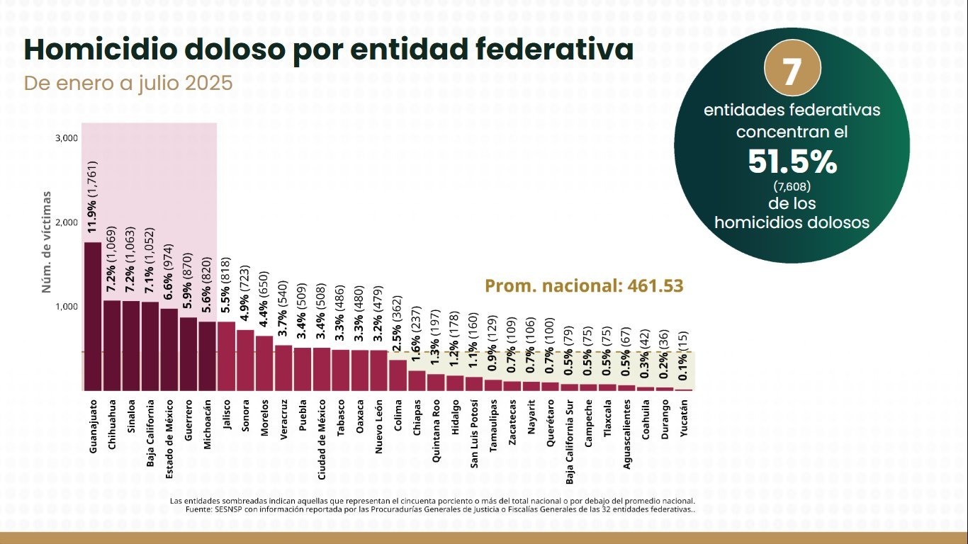 Sin embargo, en lo acumulado de enero a julio del 2025, Guanajuato sigue siendo la entidad más violenta con 1,761 homicidios dolosos, lo que representa el 11.9% del total nacional.