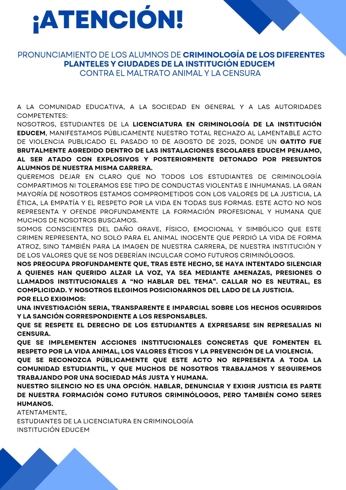 Pénjamo.- Estudiantes de la Licenciatura en Criminología de la institución EDUCEM emitieron un pronunciamiento público para rechazar de manera categórica el acto de violencia ocurrido el 10 de agosto de 2025, cuando un gato fue atado con explosivos y posteriormente detonado dentro de las instalaciones escolares, presuntamente por alumnos de la misma carrera.