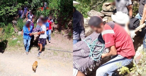 Xichú, Guanajuato.- Con palos y cobijas habitantes de la localidad Las Enramadas de Xichú improvisaron una camilla para rescatar y salvarle la vida a una mujer que estaba herida en el cerro.