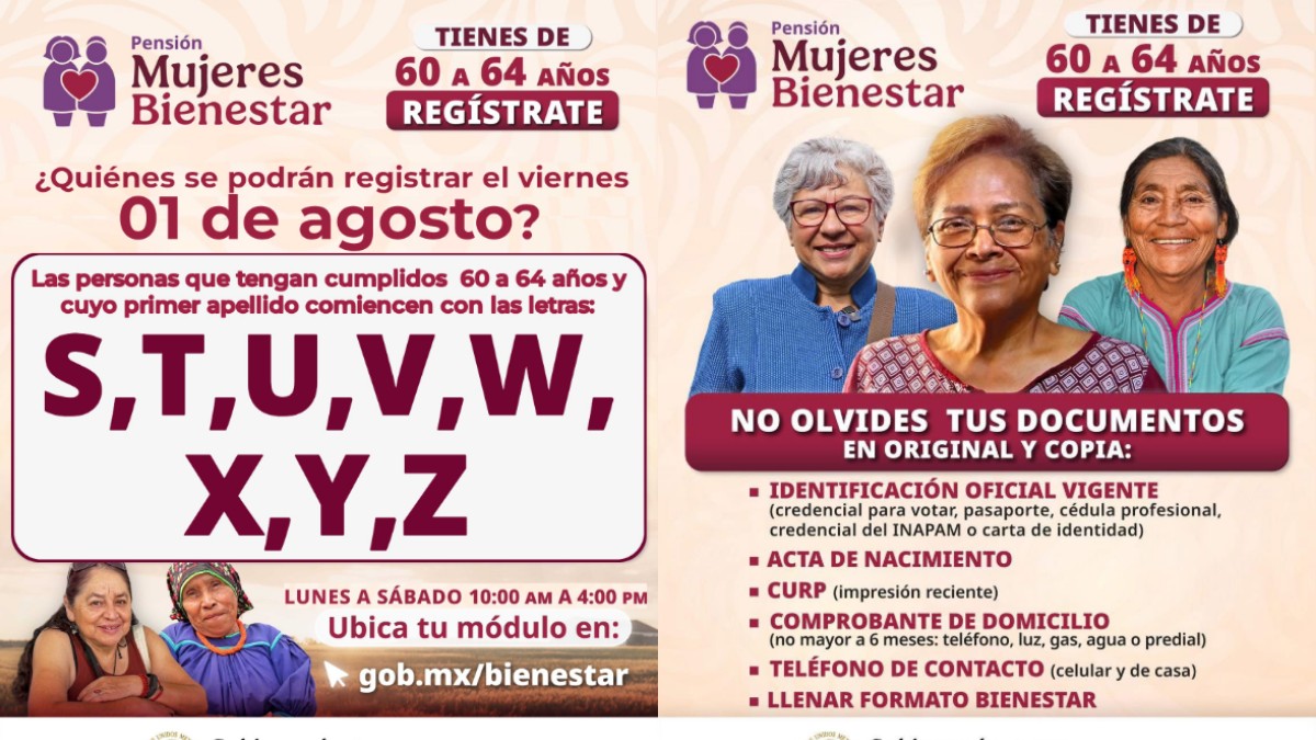 La Secretaría de Bienestar en Guanajuato anunció que este viernes 1 de agosto inicia el registro para la Pensión Mujeres Bienestar, dirigido a mujeres de 60 a 64 años cuyos apellidos comiencen con las letras S, T, U, V, W, X, Y o Z.