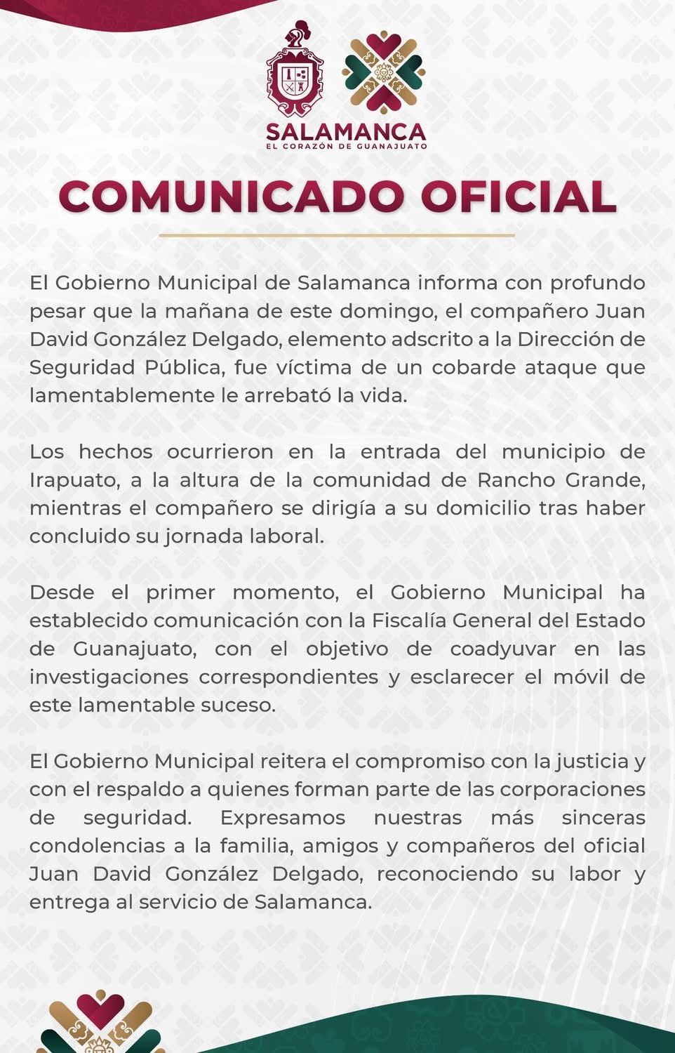 “El Gobierno Municipal de Salamanca informa con profundo pesar que la mañana de este domingo, el compañero Juan David González Delgado, elemento adscrito a la Dirección de Seguridad Pública, fue víctima de un cobarde ataque que lamentablemente le arrebató la vida”, informó el municipio en un comunicado.