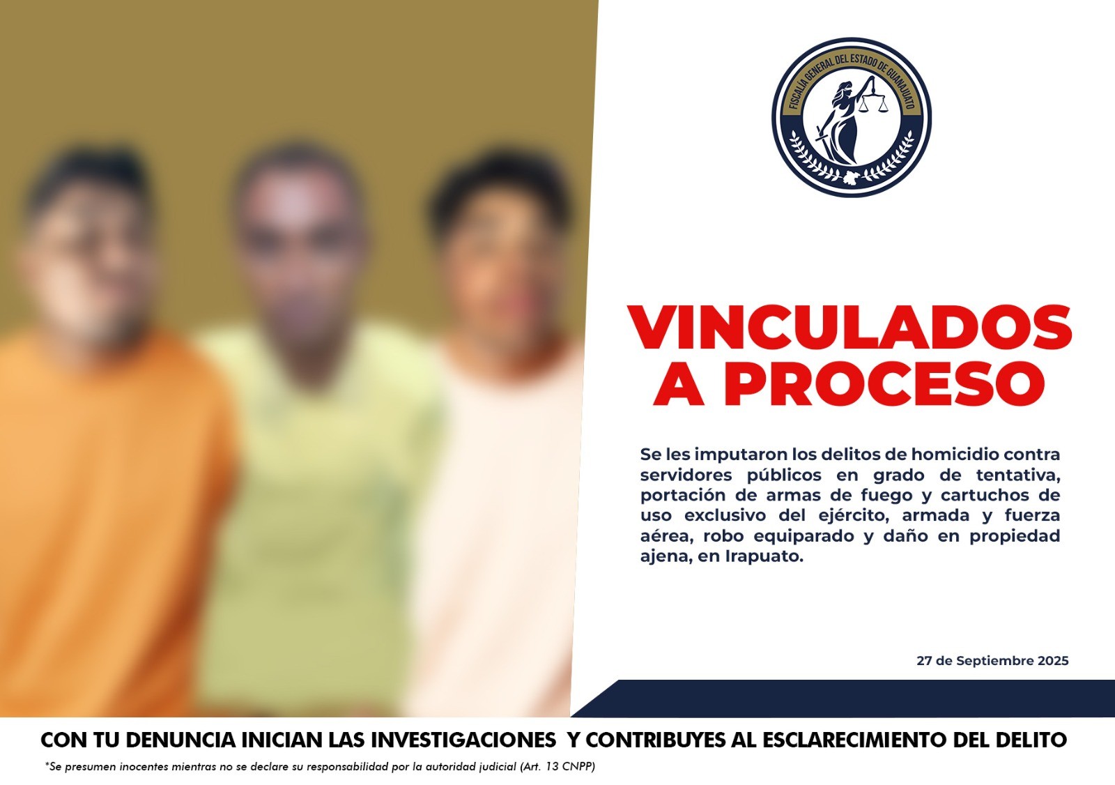 Irapuato.- La Fiscalía General del Estado de Guanajuato obtuvo la vinculación a proceso de tres hombres acusados de participar en un atentado contra elementos de seguridad en Irapuato.