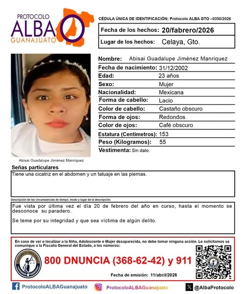 En Celaya, continúa la búsqueda de Abisai Guadalupe Jiménez Manríquez, de 23 años, quien no ha sido localizada desde el pasado 20 de febrero.