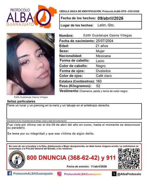 También se busca a Edith Guadalupe Gaona Villegas, de 21 años, desaparecida el 9 de abril en León.