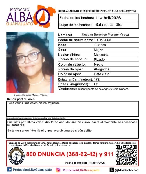 Uno de los casos es el de Susana Berenice Moreno Yépez, de 19 años, quien fue vista por última vez el 11 de abril en Salamanca.