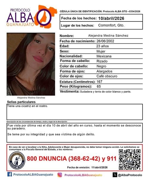Otro caso corresponde a Alejandra Medina Sánchez, de 23 años, vista por última vez el 10 de abril en el municipio de Comonfort.