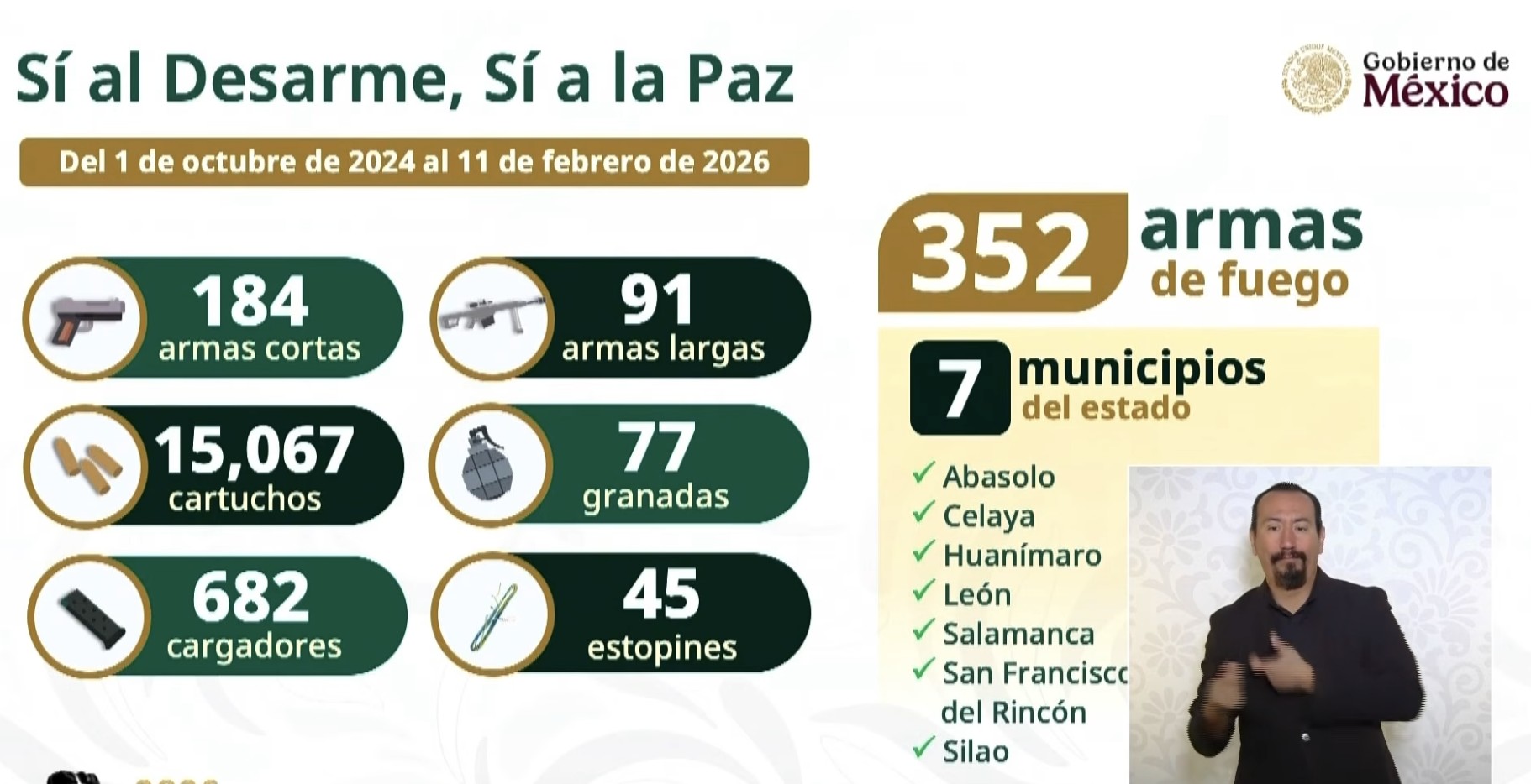 Detalló que del 1 de octubre de 2024 al 15 de febrero de 2026 se han detenido 4 mil 400 personas, todas puestas a disposición del Ministerio Público. Además, se aseguraron más de cinco toneladas de droga —incluidas mil pastillas de fentanilo—, más de 6 mil 400 armas de fuego y más de 200 mil cartuchos.