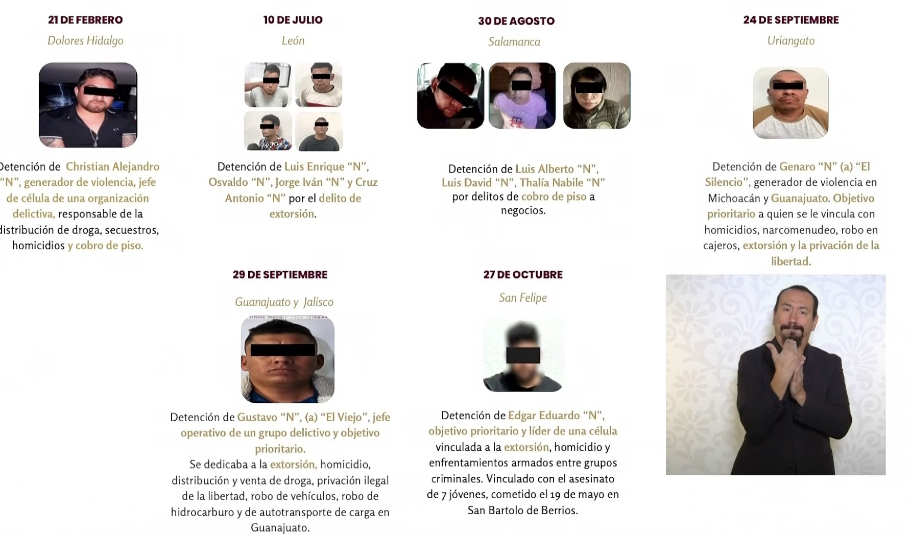 Asimismo, se informó sobre la detención de integrantes del Cártel de Santa Rosa de Lima relacionados con diversos hechos violentos en Salamanca, Irapuato, Celaya y otros municipios.