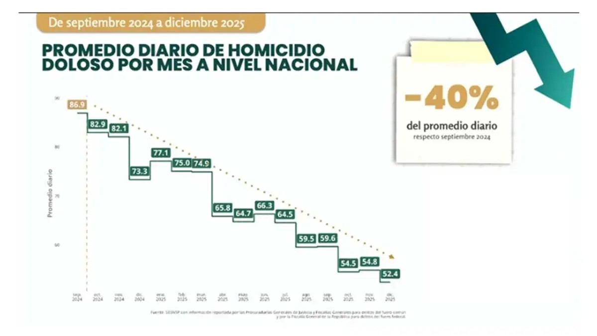 “La reducción comenzó a partir de febrero de 2025, sumando ya 10 meses consecutivos de disminución constante en Guanajuato. Se pasó de registrar hasta 12.7 homicidios diarios a 4.87 en diciembre, el mes que acaba de concluir”, detalló la funcionaria.