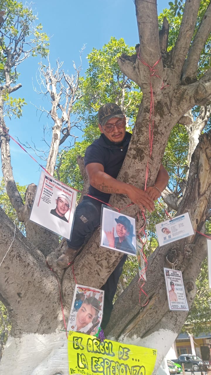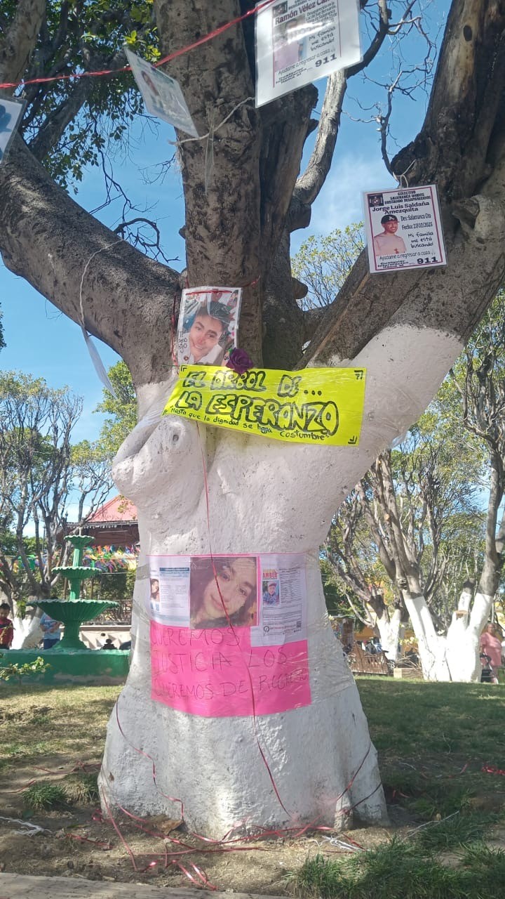 El árbol, que funciona como memorial, se ubica en el centro del municipio. Es un espacio simbólico de memoria para personas desaparecidas, donde se colocaron fotografías y fichas de búsqueda de los municipios mencionados.