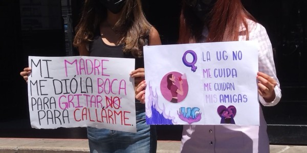 La concentración de alumnas inició a las 12:00 del mediodía, donde las inconformes hicieron carteles, mismos que colocaron en las paredes y barandales de la fachada de la escuela ubicada en la calle Álvaro Obregón. En los carteles se leen algunas frases, donde las víctimas comparten su sentir en la institución, como: “En psicología no estamos seguras”, “La UG es igual que la policía, no hacen nada”, “Mi madre me dio la boca para gritar, no para callarme”, “La UG no me cuida, me cuidan mis amigas”, “Las alumnas no son tus amigas, respeta el límite”, entre otras. [caption id="attachment_117131" align="alignnone" width="1200"]