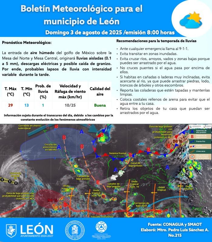 León.- Este domingo 3 de agosto, el municipio de León podría experimentar lluvias aisladas, tormentas eléctricas e incluso caída de granizo, según advirtió Protección Civil a través de su boletín meteorológico.