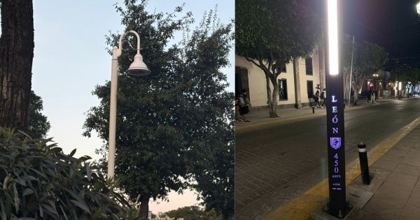Desde el Puente del Amor se colocaron este tipo de lámparas, que también se han colocado algunas en la zona Centro de León, como en la calle Francisco I. Madero.