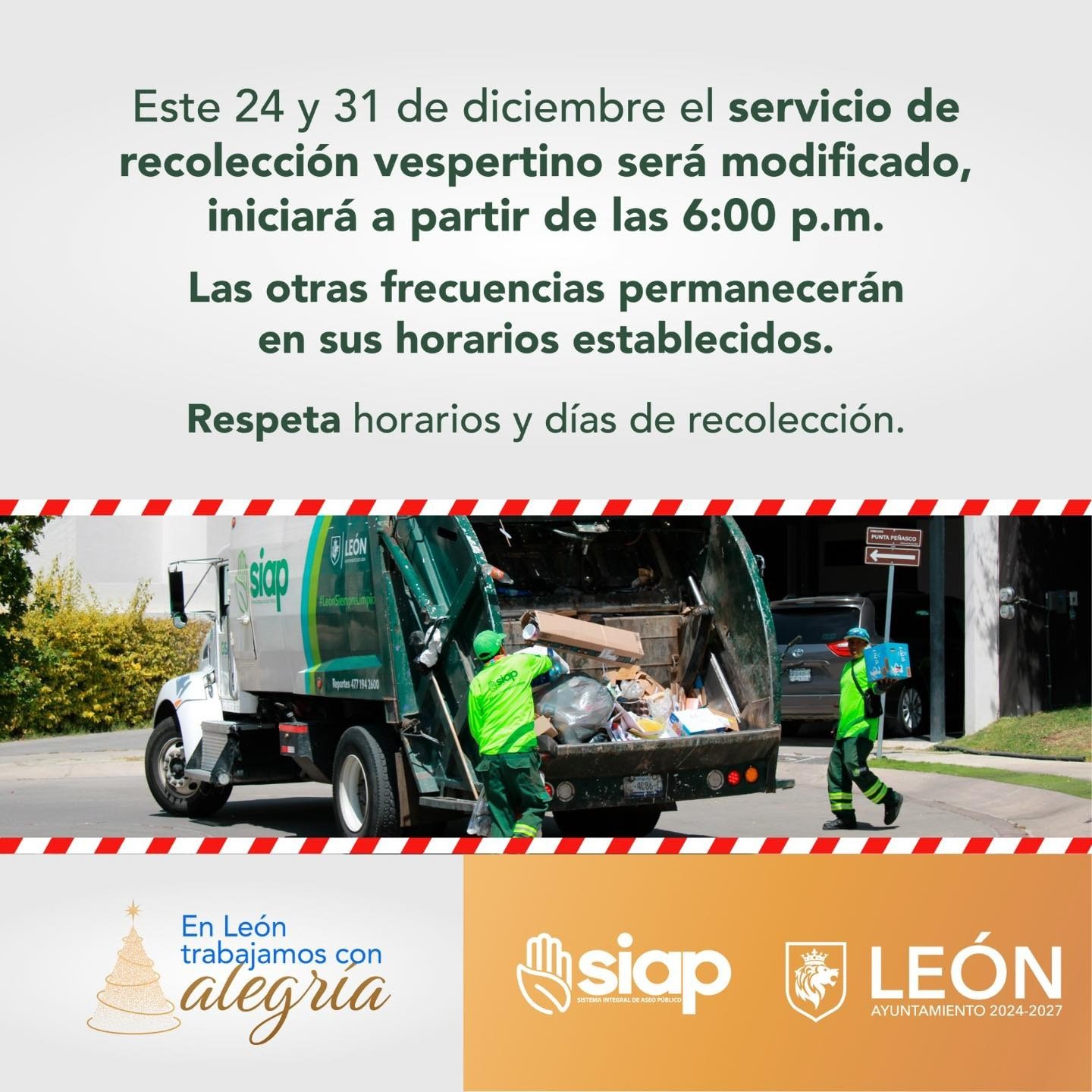24 y 31 de diciembre: El servicio iniciará una hora antes de lo habitual. Si normalmente pasa a las 8:00 PM, prepárate para tener tus bolsas listas desde las 7:00 PM.