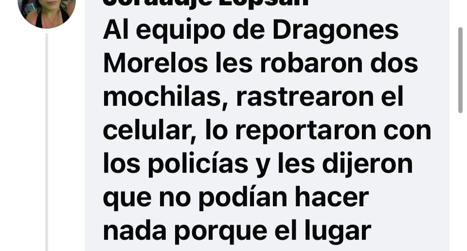 “Al equipo Dragones Morelos les robaron mochilas, rastrearon el celular, lo reportaron con policías y dijeron que no podían hacer nada porque el lugar a donde mandaba la ubicación el celular era una zona muy peligrosa” añadió otra usuaria de Facebook.