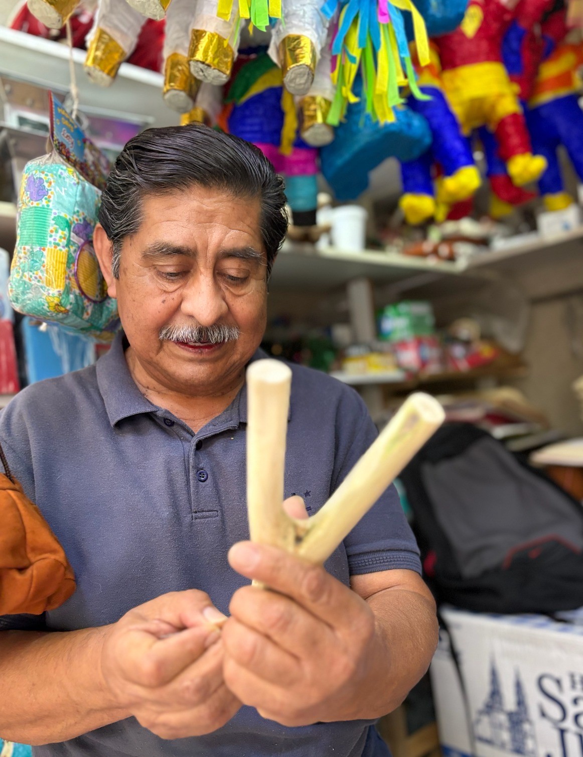 “El juguete tradicional cada vez se disminuye y haber hasta dónde llegamos, vendo resorteras, trompos, baleros, yoyos, trompos de madera, juguete de barro” platicó don Fernando mientras le daba acabado a una resortera.