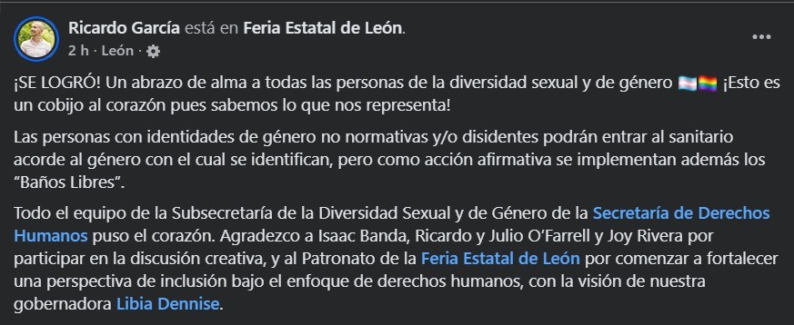 La iniciativa fue desarrollada con la participación del equipo de la Subsecretaría de la Diversidad Sexual y de Género de la Secretaría de Derechos Humanos, en coordinación con el Patronato de la Feria Estatal de León, como parte de un esfuerzo por fortalecer una perspectiva de inclusión en eventos públicos de gran afluencia.