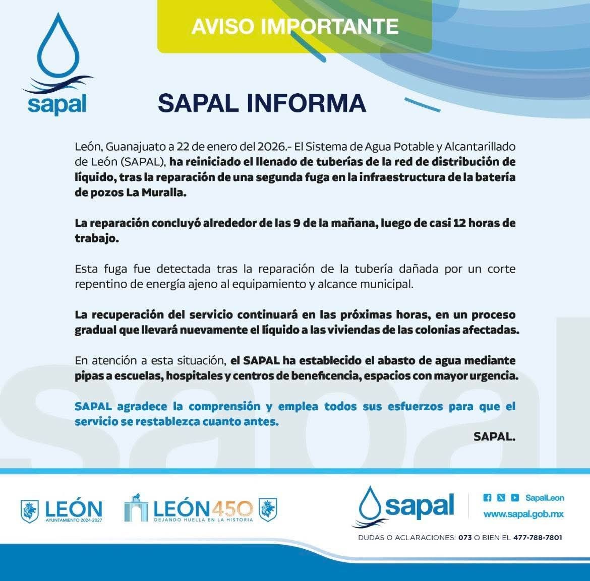 Lepon.- El director del Sistema de Agua Potable y Alcantarillado de León (SAPAL), Enrique De Aro Maldonado, confirmó que el suministro de agua inició su restablecimiento tras la reparación de una megafuga detectada el pasado martes, así como de una fuga adicional que afectó el servicio en diversas zonas de la ciudad.