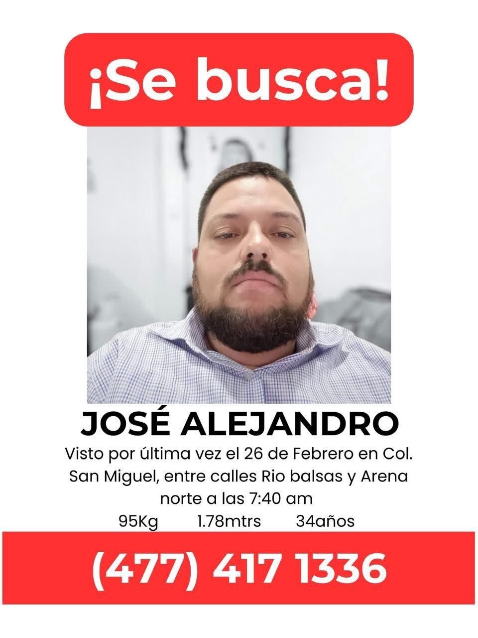 José Alejandro tiene una estatura de 1.78 metros, pesa aproximadamente 95 kilogramos y tiene el cabello castaño. Las autoridades y familiares solicitan que cualquier información que ayude a dar con su paradero sea reportada de inmediato al sistema de emergencias 911*o al número 800 DNUNCIA (368-62-42).