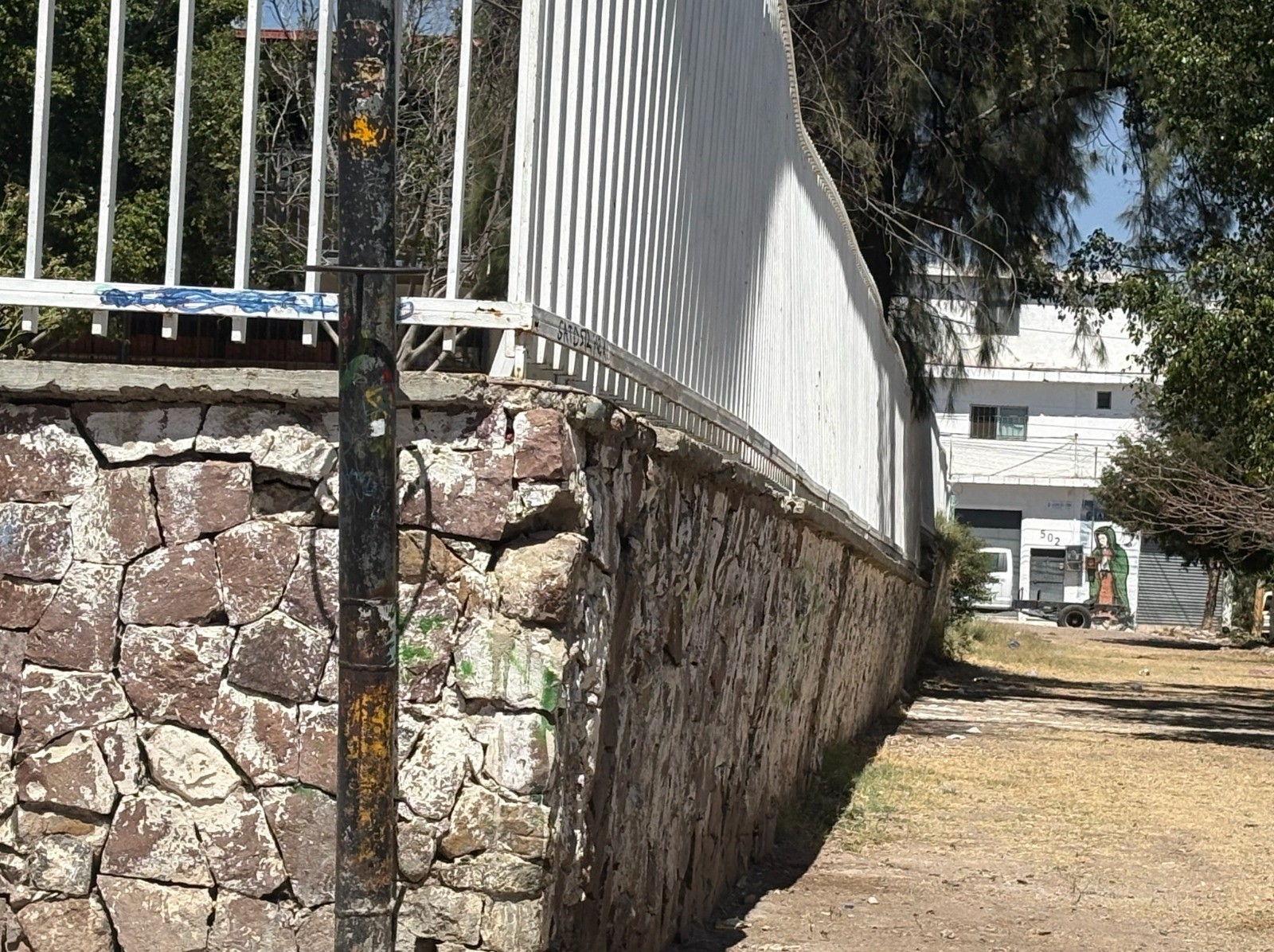 León.- Las bardas de la escuela primaria pública Maestro Zarza están pandeadas, cuarteadas y llenas de hoyos por lo que padres de familia piden apoyo de las autoridades.
