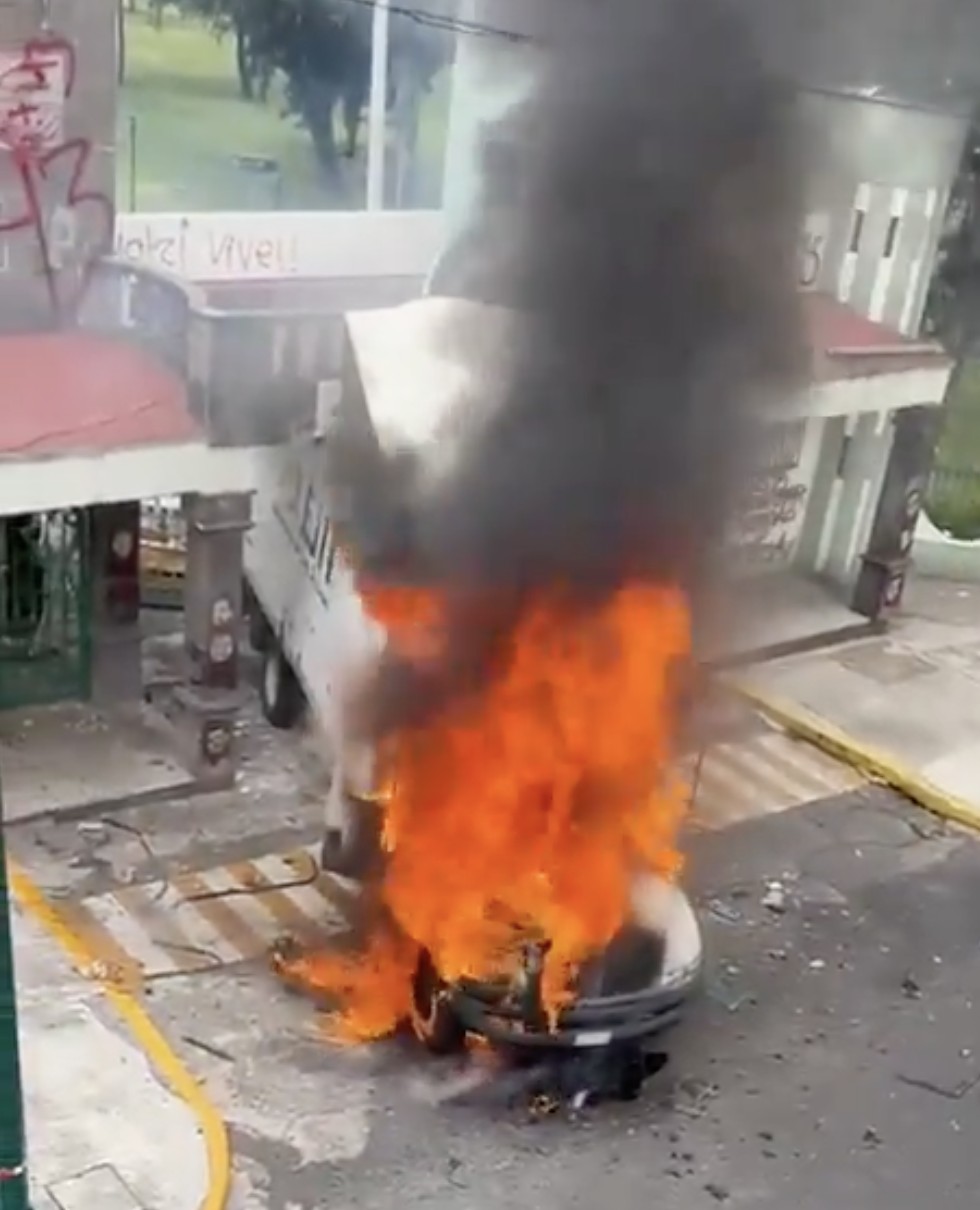 El vehículo, que transportaba diversas bebidas, quedó completamente destruido tras el incendio. Además, los manifestantes detonaron cohetones frente a la puerta 1 del Campo Militar, luego de entonar el himno Venceremos al finalizar el mitin encabezado por los padres de los normalistas desaparecidos.