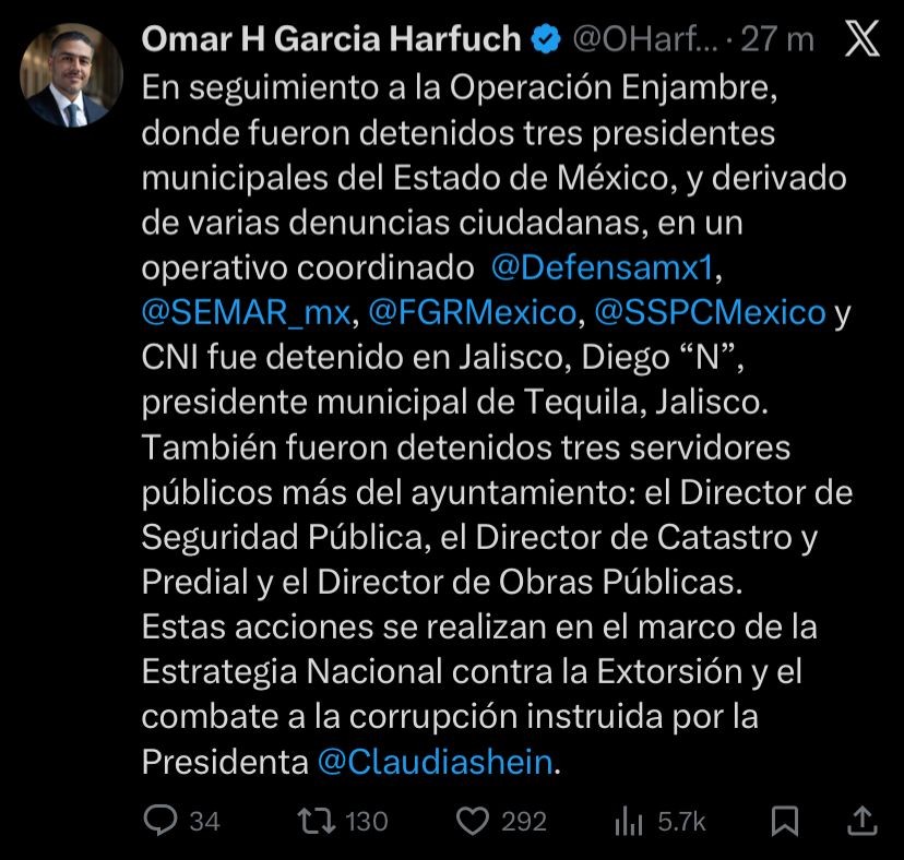 CDMX.- Como parte de la Operación Enjambre, fuerzas federales detuvieron al presidente municipal de Tequila, Jalisco, Diego “N”, así como a tres funcionarios de su administración, por su presunta participación en actos de extorsión y corrupción.