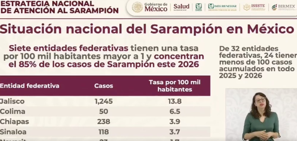 CDMX.- La Secretaría de Salud (Ssa) informó que en México se han registrado 9,074 casos de sarampión entre 2025 y 2026, lo que representa una tasa de 6.7 contagios por cada 100 mil habitantes a nivel nacional.