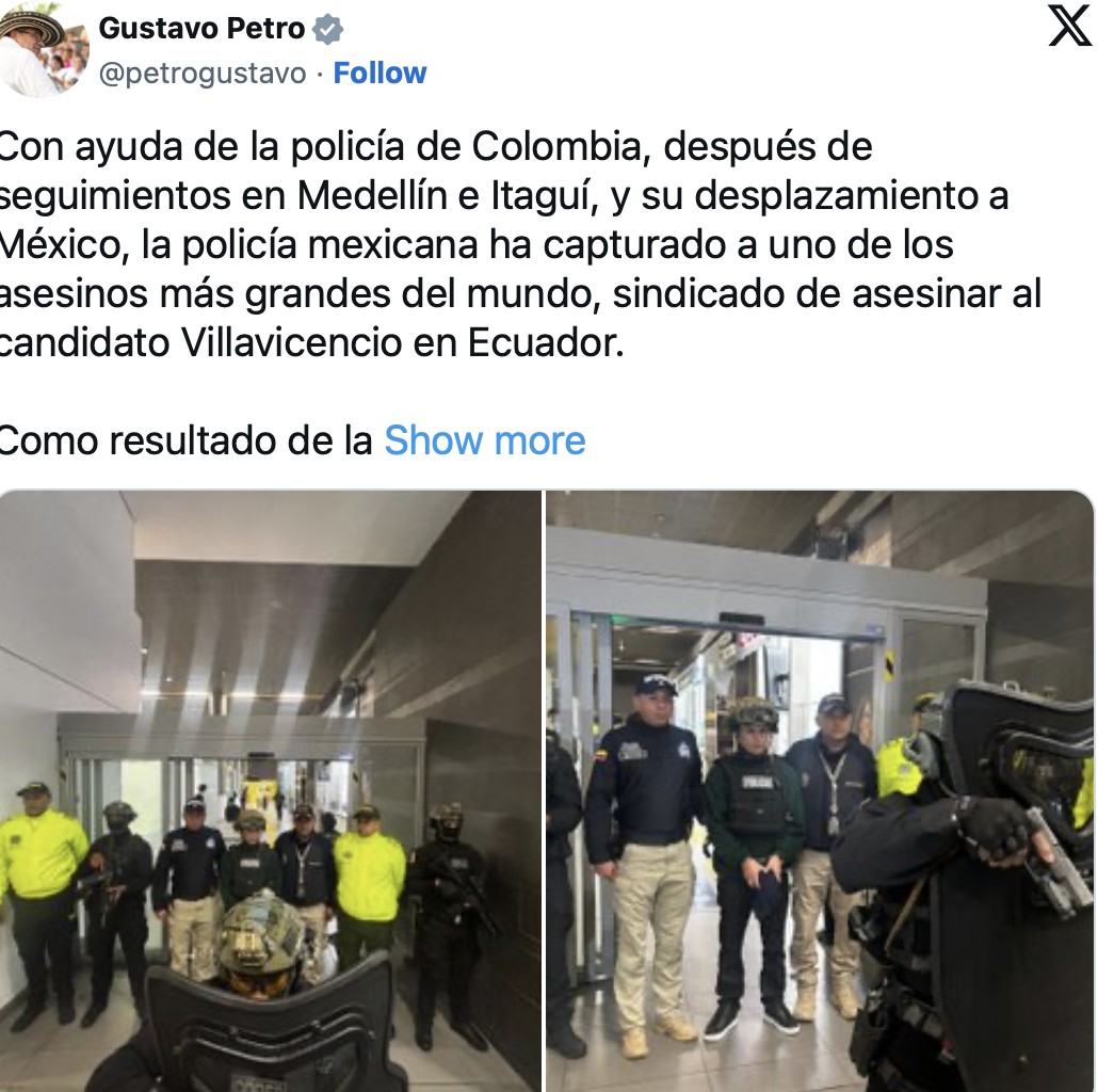 Por su parte, el presidente de Colombia, Gustavo Petro, precisó que la aprehensión se realizó en la zona de Polanco, de la capital mexicana tras un seguimiento de este sujeto por Medellín e Itaguí.