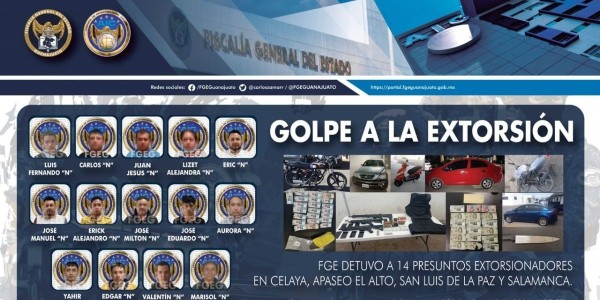En operativos realizados en Celaya, Apaseo el Alto, San Luis de la Paz y Salamanca fueron detenidos 14 hombres acusados de extorsión. Luego de varias denuncias, la Agencia de Investigación Criminal dirigida por el Ministerio Público se dedicó a recabar elementos de prueba con los que fue posible capturar y obtener la vinculación a proceso penal de los imputados por el delito de extorsión agravada. Además se logró el aseguramiento de vehículos de motor, armas de fuego, equipo de telefonía y dinero en efectivo. El análisis e intercambio de información generado en torno a los ilícitos de extorsión contra comerciantes de dichas entidades, quedó integrado en las respectivas carpetas de investigación y acreditado ante un juez. /r