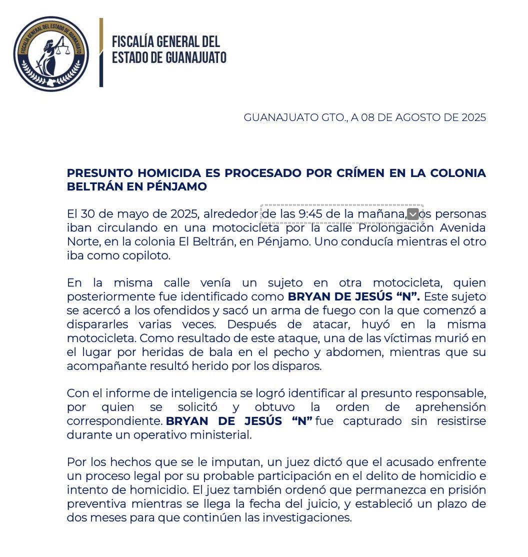 Pénjamo.- El 30 de mayo de 2025, alrededor de las 9:45 de la mañana, dos personas circulaban en una motocicleta por la calle Prolongación Avenida Norte, en la colonia El Beltrán, en Pénjamo, cuando fueron interceptadas por un hombre en otra motocicleta.
