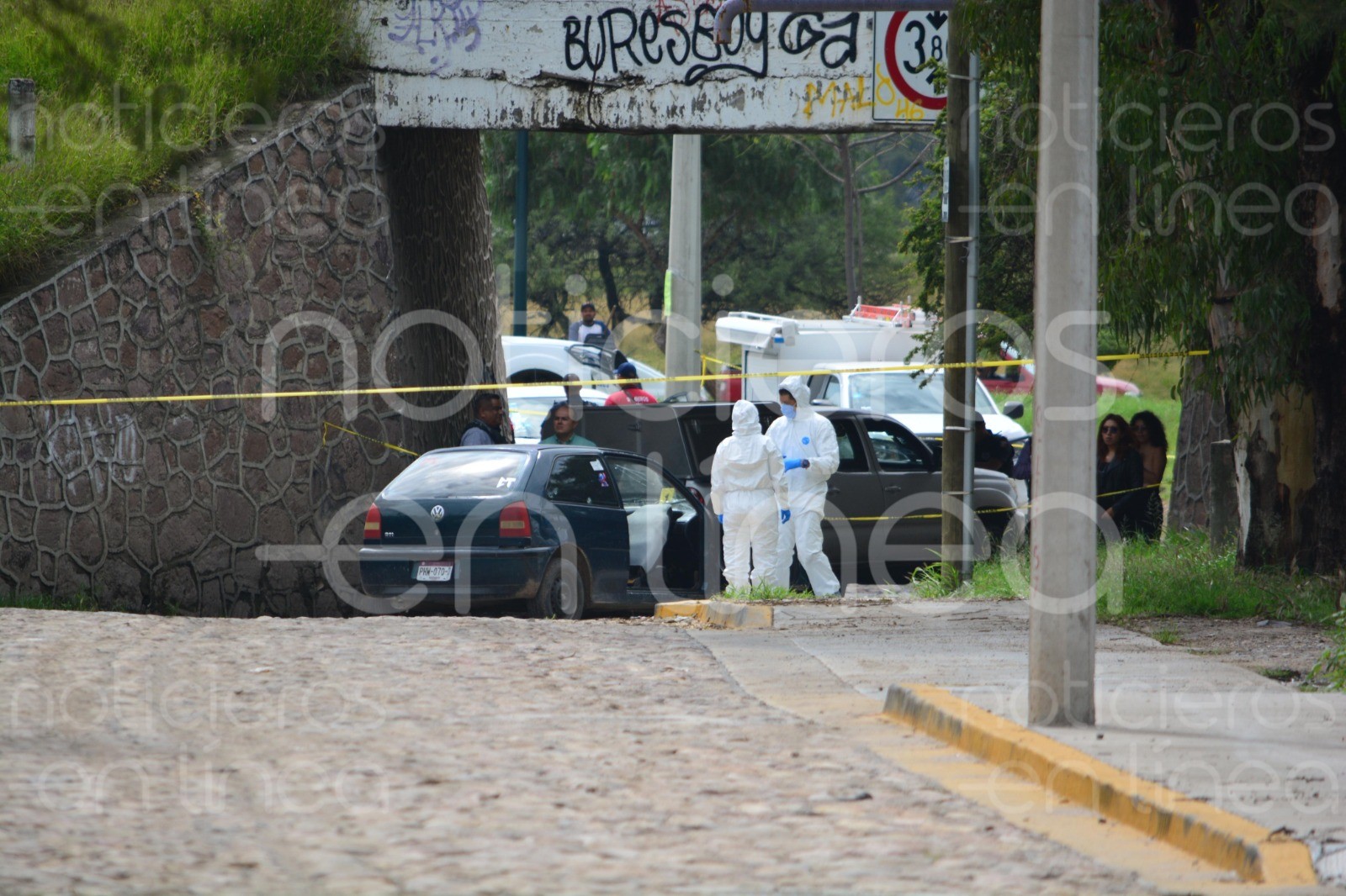 Los cuerpos fueron localizados dentro de un auto Volkswagen Pointer, color verde, que quedó bajo resguardo de las autoridades.