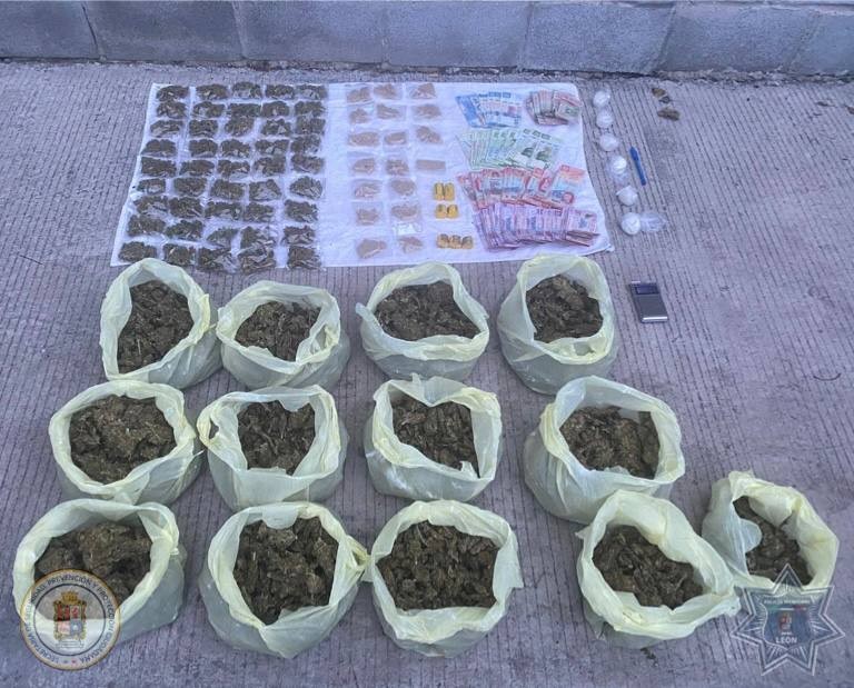 Durante la intervención, se logró el aseguramiento de lo siguiente: 45 bolsas con marihuana, 18 envoltorios de piedra base, 13 bolsas con aproximadamente medio kilogramo de marihuana , 4 envoltorios con cristal, 2 envoltorios con cocaína, 1 arma de fuego larga artesanal con un cartucho útil y más de 18 mil pesos en efectivo y 3 teléfonos celulares.