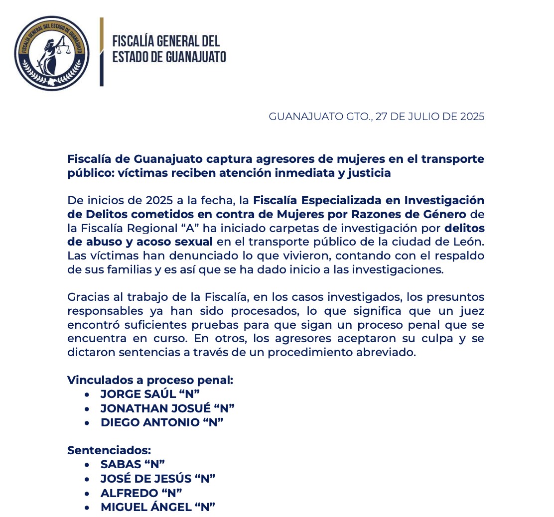 Entre los sentenciados se encuentran Carlos Daniel “N”, Juan Carlos “N” y Óscar “N”, quienes enfrentaron procesos por abuso sexual y fueron condenados a prisión. Por otro lado, los vinculados a proceso, en espera de resolución judicial, son Juan Pablo “N”, Rafael “N” y Cristian “N”, quienes fueron detenidos tras ser señalados en distintos hechos ocurridos en paraderos del transporte público.