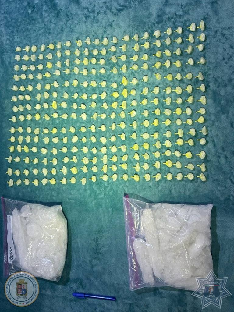 León.– En un operativo de vigilancia, elementos de la Policía Municipal detuvieron a un hombre en la colonia La Campiña que portaba una maleta con aproximadamente 280 dosis de cristal y dos bolsas que contenían unos 5 kilogramos de la misma sustancia.