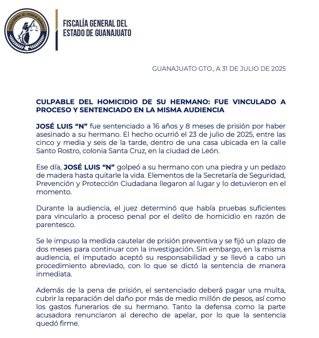 León.– En un hecho inusual por su rapidez procesal, un hombre fue vinculado a proceso y sentenciado en la misma audiencia por el homicidio de su propio hermano, ocurrido el pasado 23 de julio en la colonia Santa Cruz, en León.