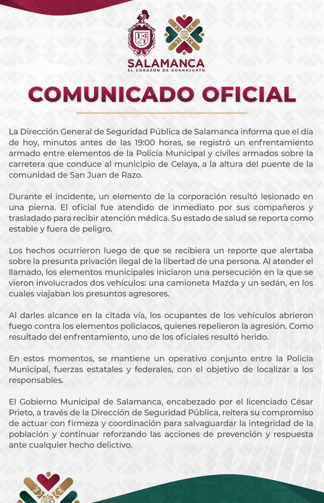 Salamanca.– Una jornada violenta se registró este sábado en el municipio de Salamanca, con dos hechos armados que movilizaron a las corporaciones de seguridad municipales, estatales y federales.El primer suceso ocurrió minutos antes de las 19:00 horas sobre la carretera que conduce a Celaya, a la altura del puente de la comunidad San Juan de Razo.