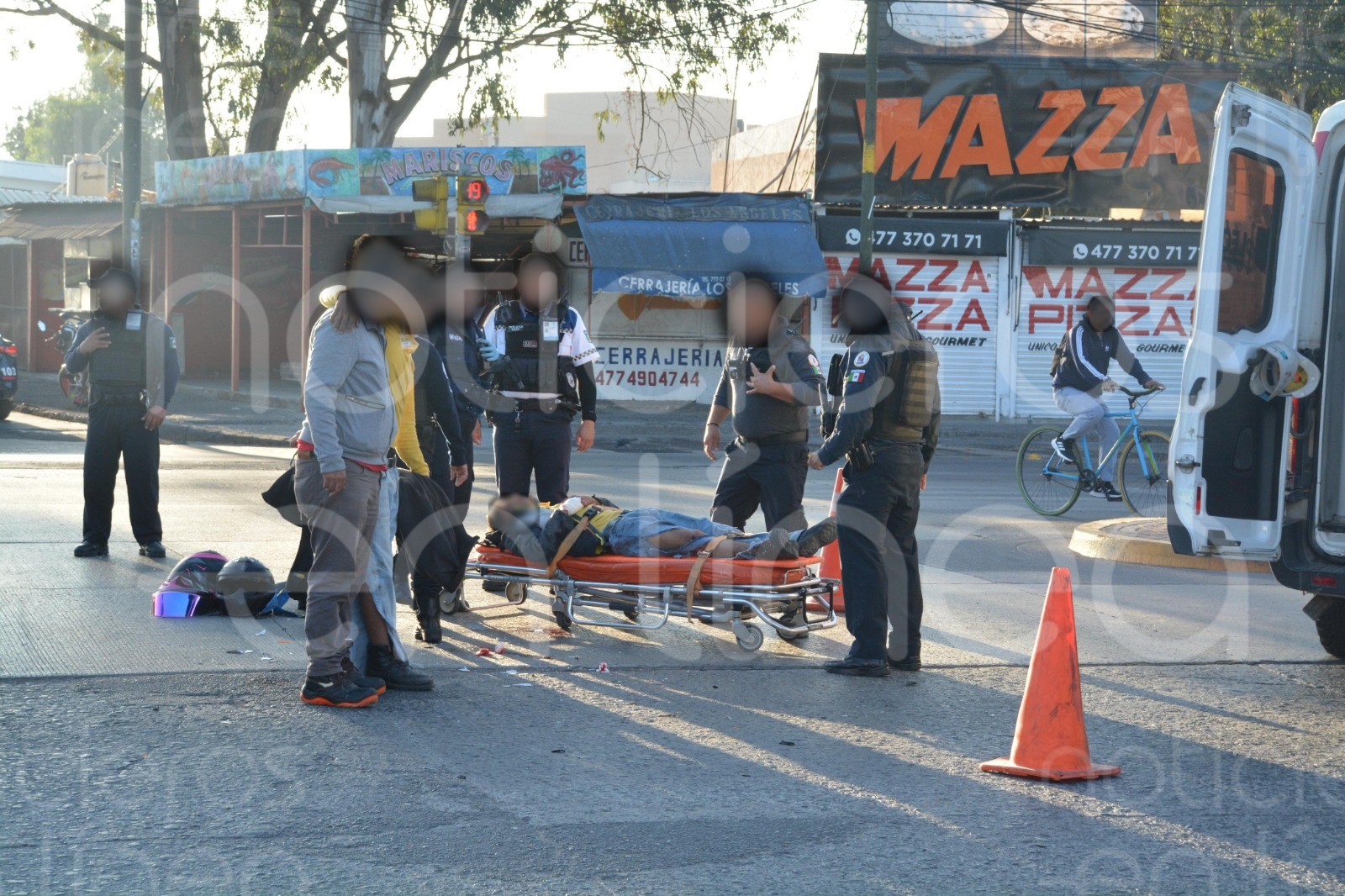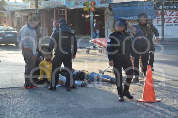 LEÓN.- La mañana de este viernes se registró un aparatoso accidente entre una motocicleta y una camioneta de redilas en el cruce del bulevar Francisco Villa y el bulevar Saturno, en la colonia Los Ángeles.
