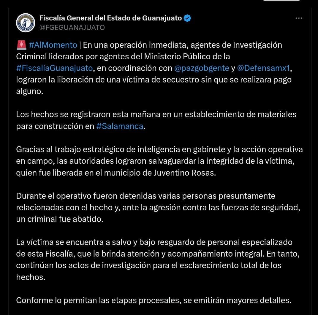 Tras el despliegue de labores de inteligencia en gabinete y acciones operativas en campo, las autoridades lograron ubicar y liberar a Arredondo en el municipio de Juventino Rosas, sin que se realizara pago alguno por su rescate.