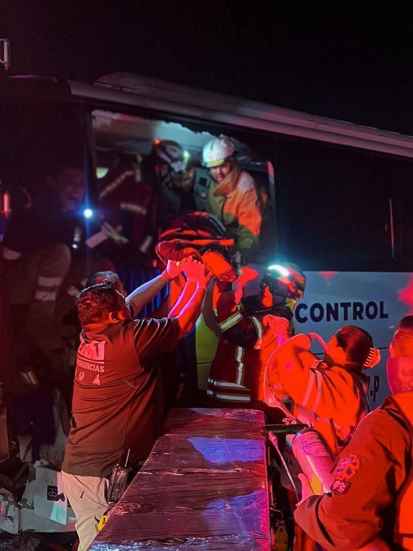 Paramédicos de la Cruz Roja y de Protección Civil brindaron atención a los trabajadores lesionados en el lugar. Bomberos realizaron maniobras para rescatar al chofer del camión de personal, quien quedó atrapado entre los fierros retorcidos de la cabina.