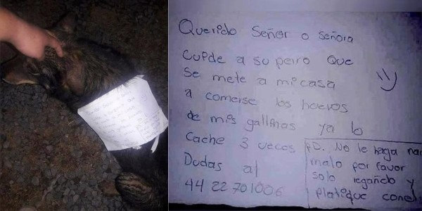“Querido señor o señora, cuide a su perro que se mete a mi casa a comerse los huevos de mis gallinas, ya lo caché tres veces”.